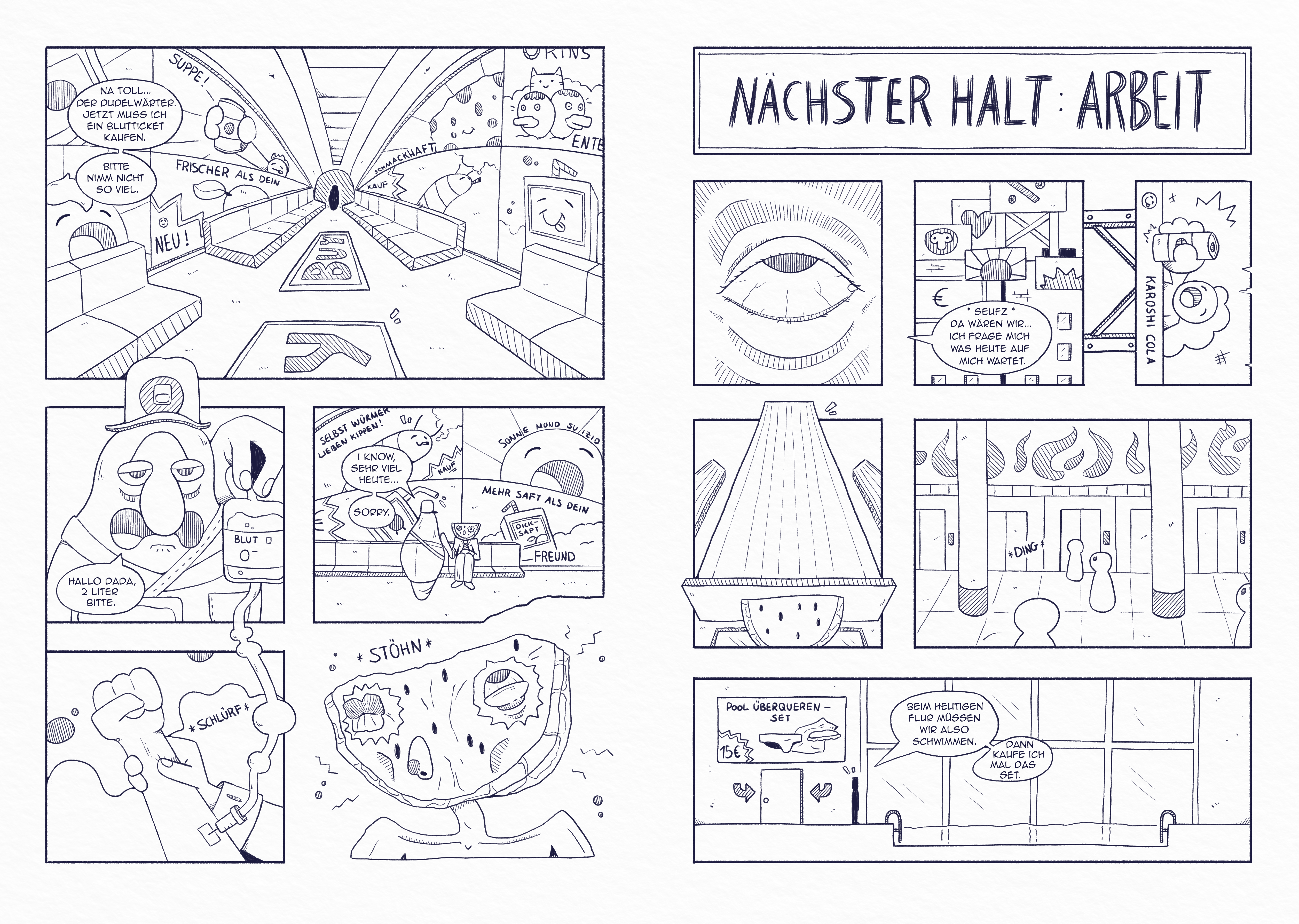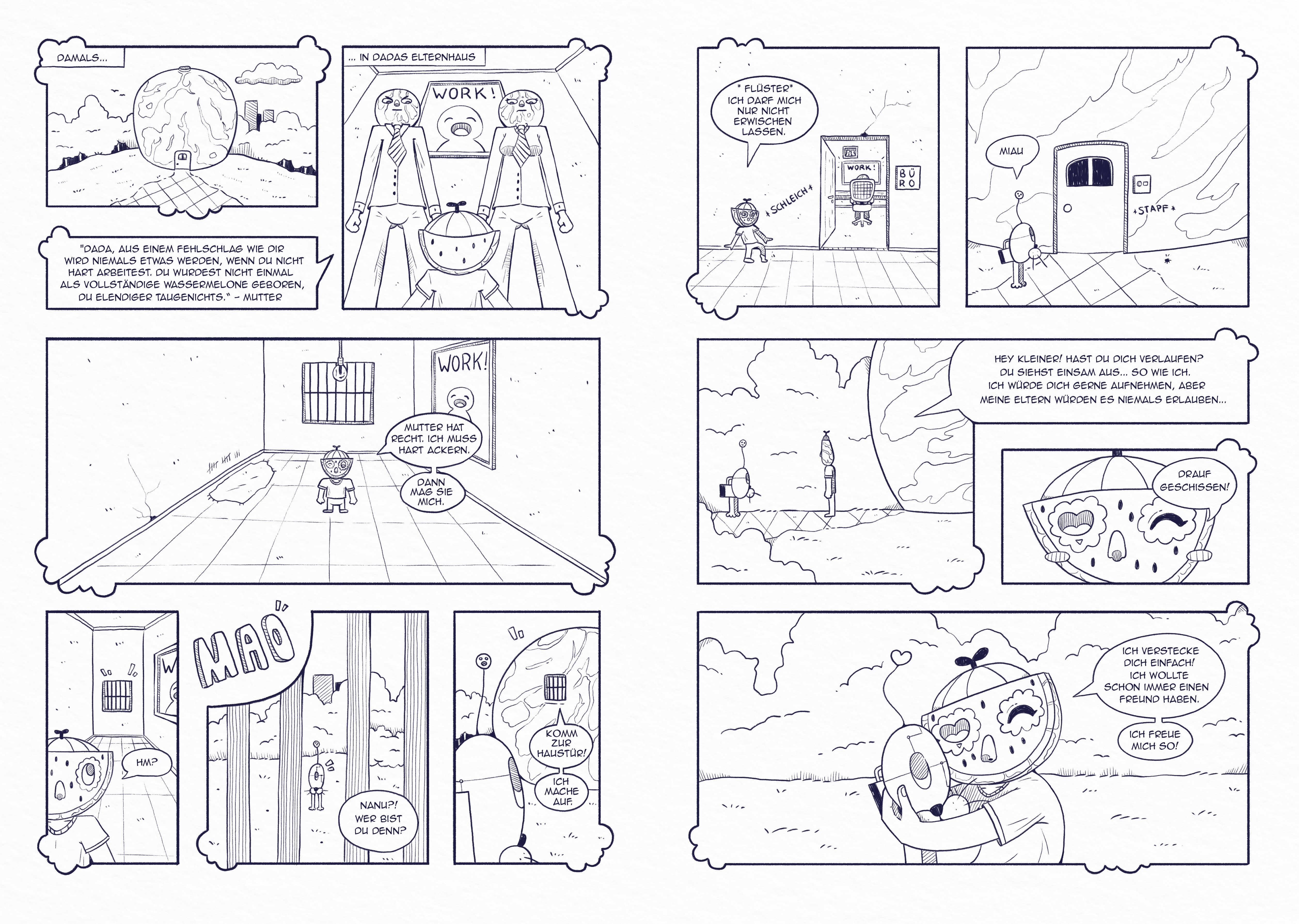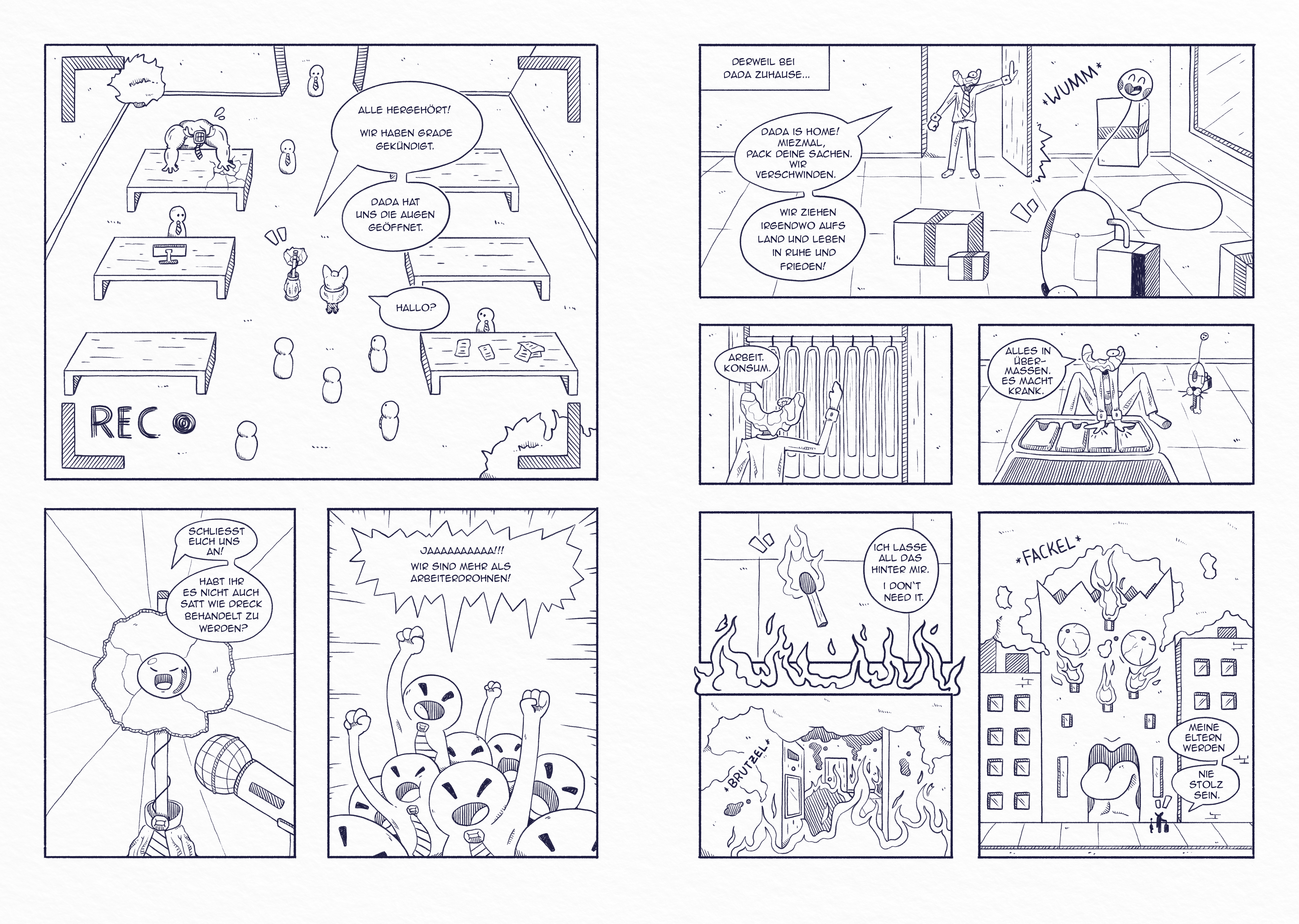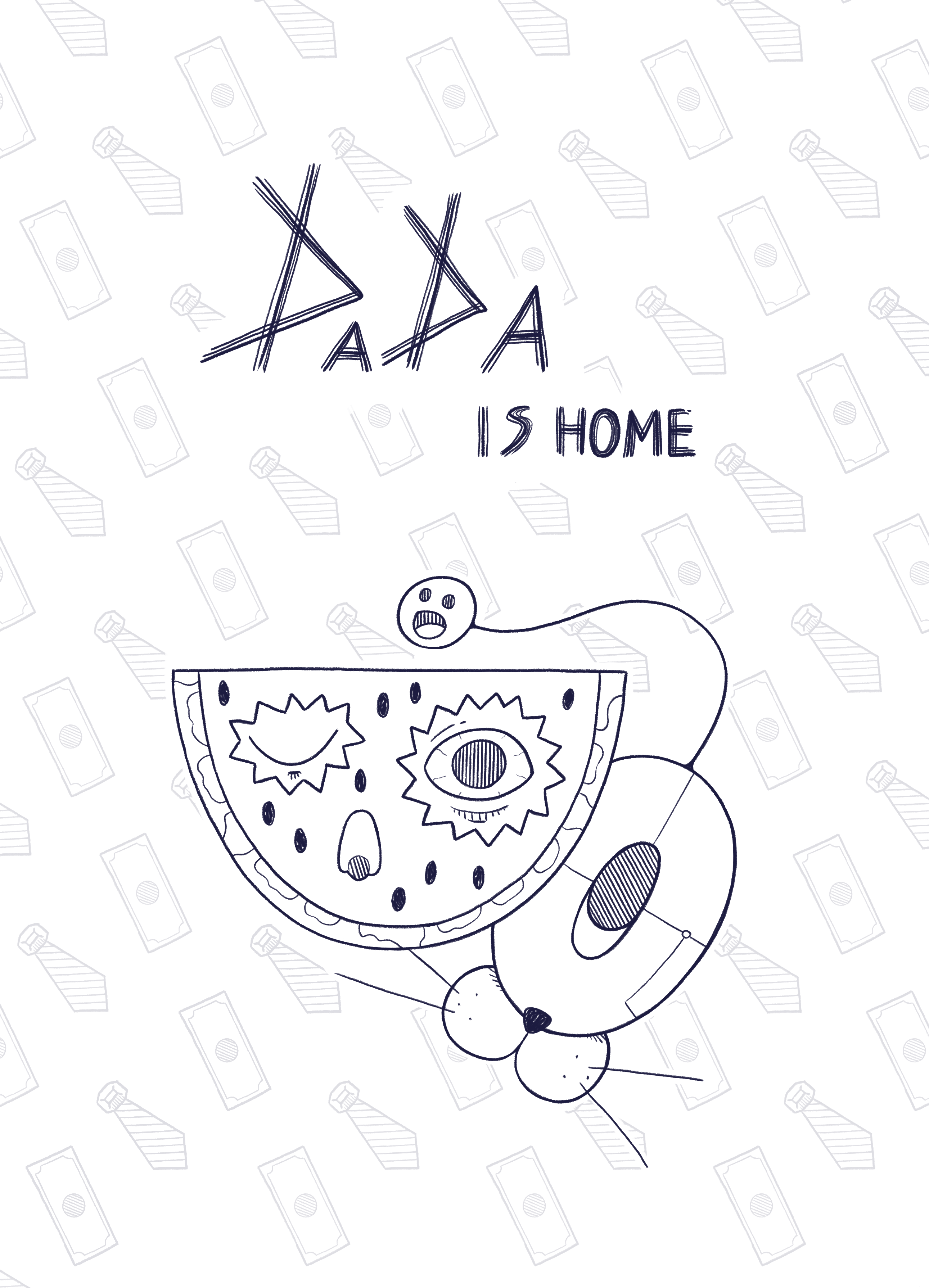 Dada is Home ist ein Comic über den Alltag in einer zukünftigen, humorvoll überspitzen, kapitalistischen Gesellschaft. Parallelen zu unserer modernen Konsumgesellschaft werden mithilfe surrealer und ungewöhnlicher Bildmotive dargestellt und analysiert. Das Blau-Weiße Farbschema, verbunden mit crosshatching Elementen, simuliert eine von Firmen dominierte Welt.