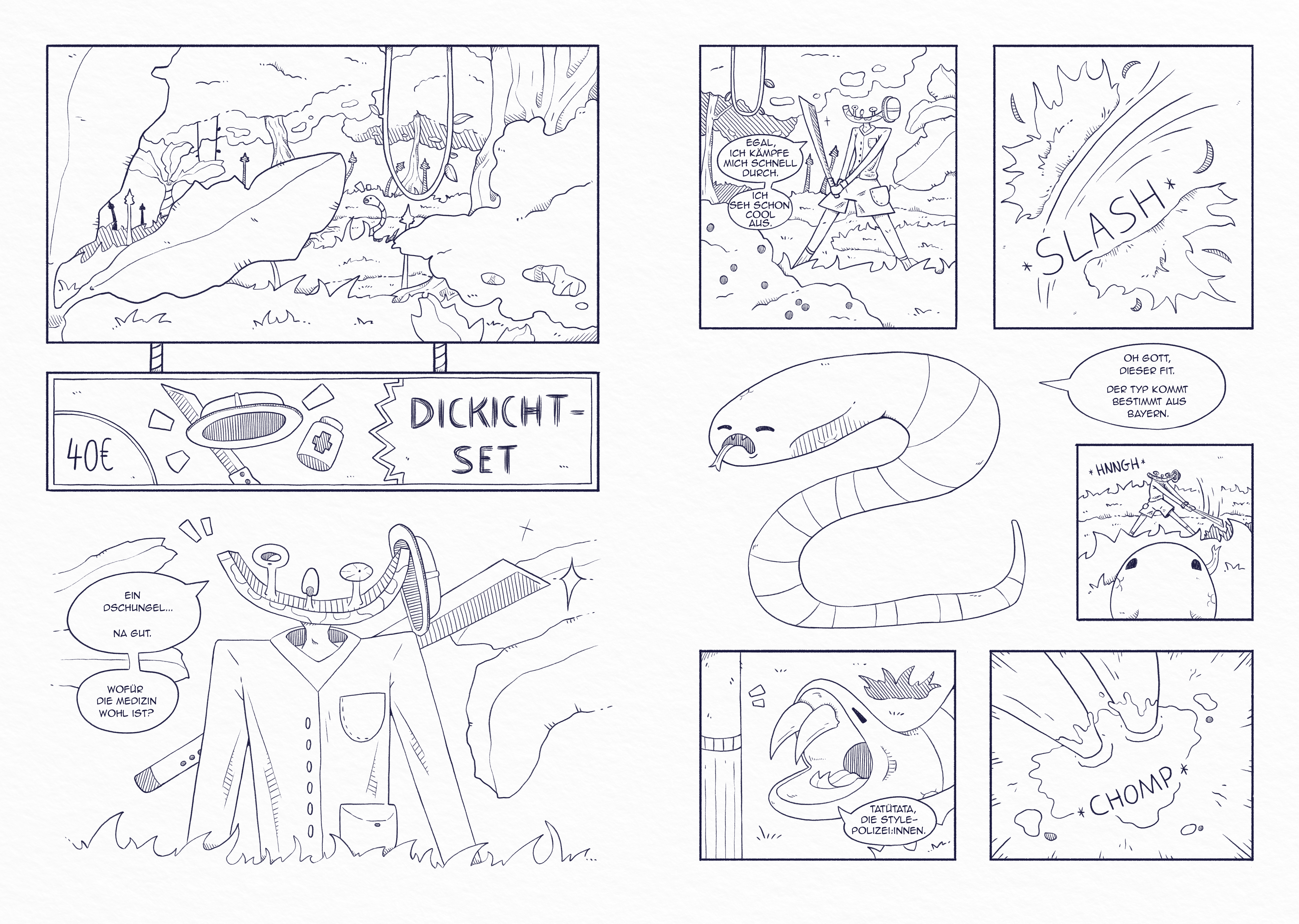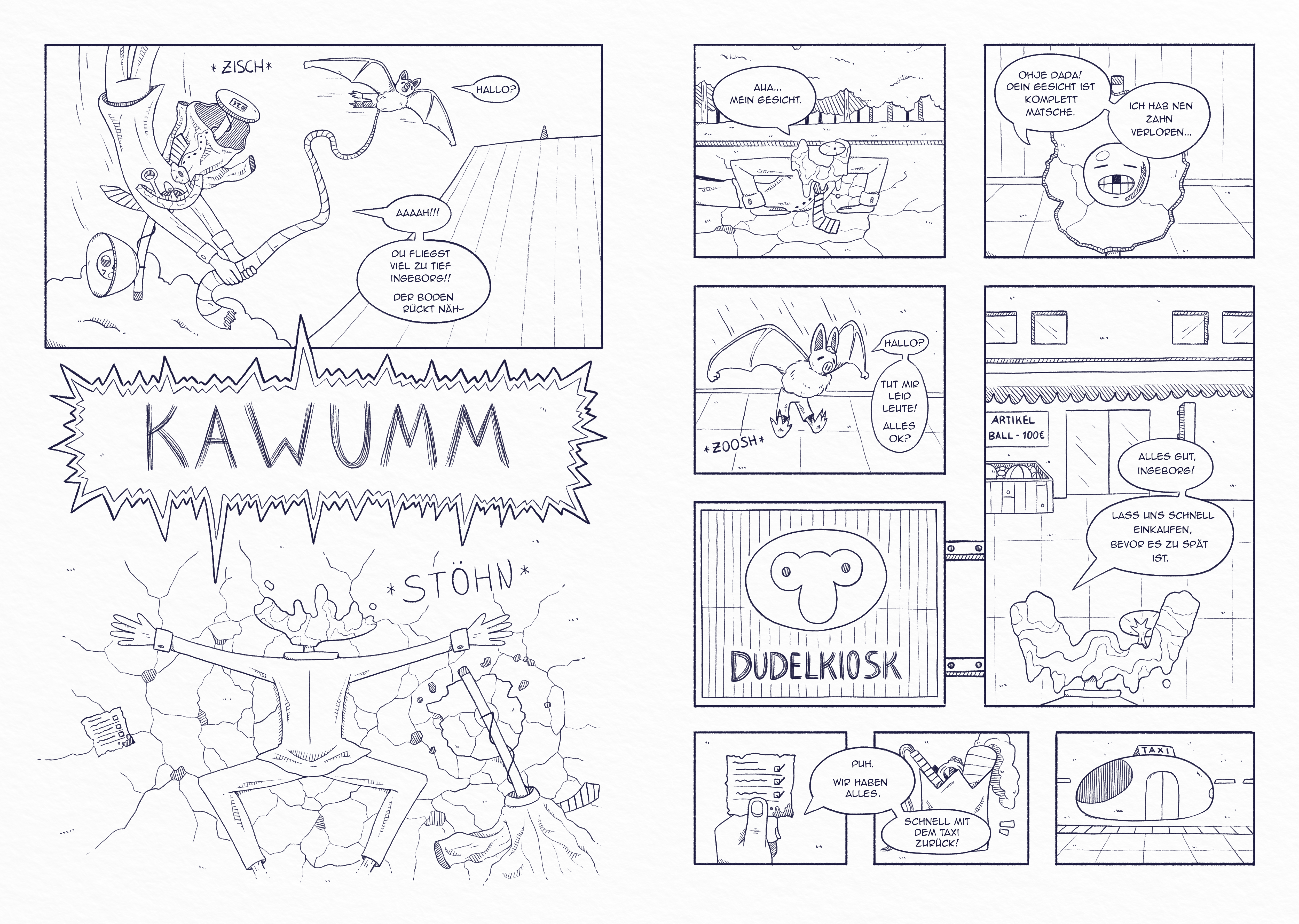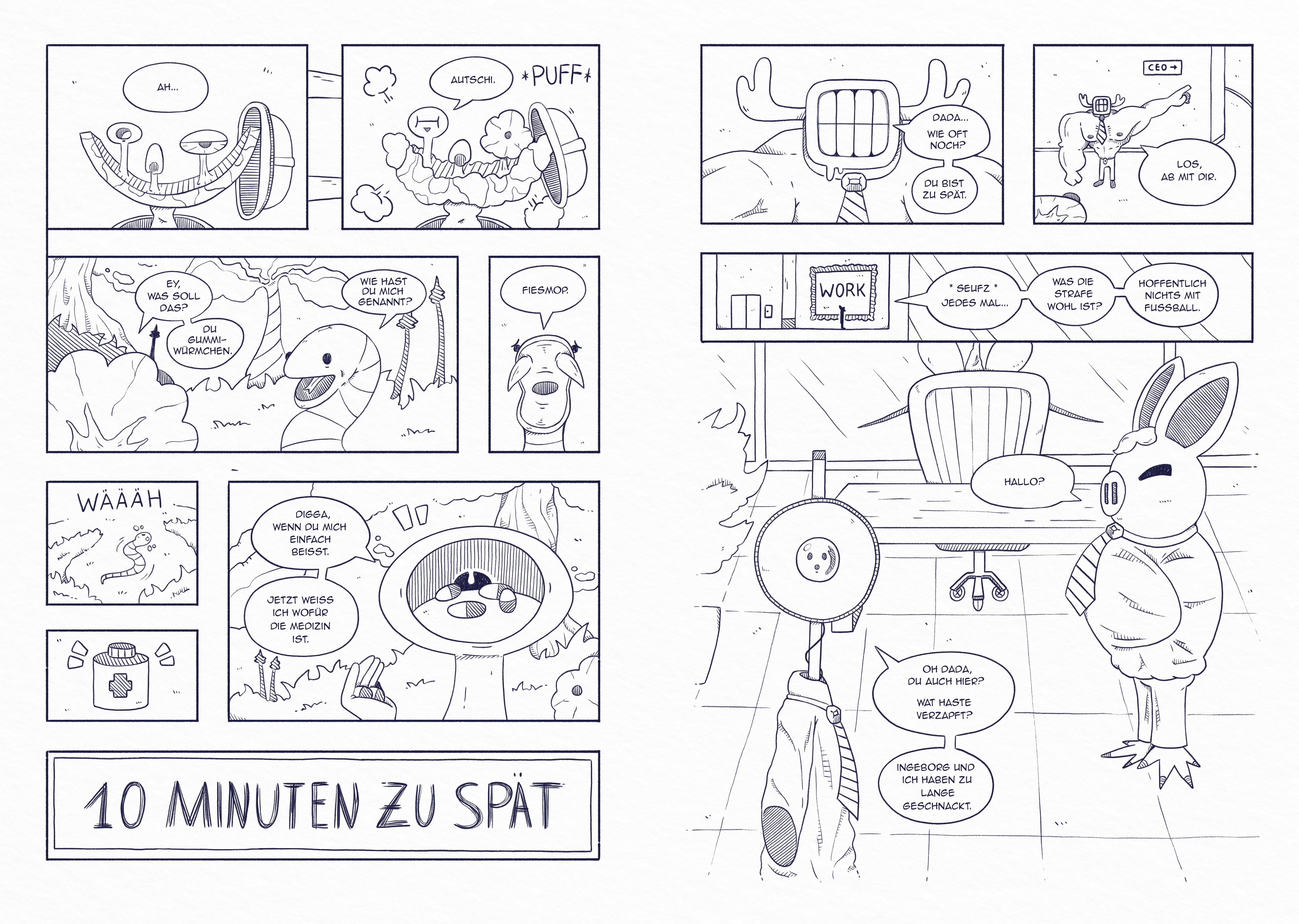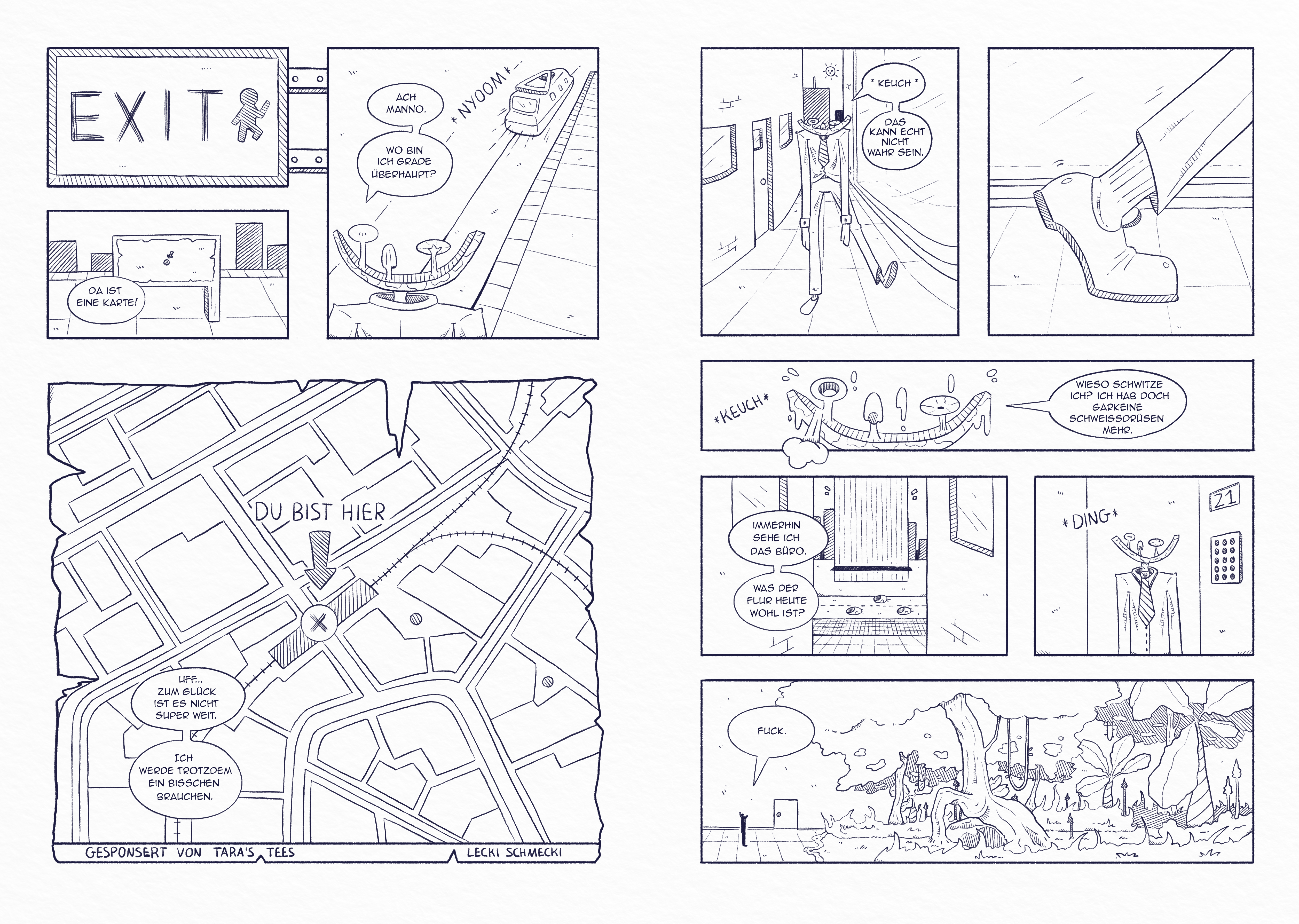 Dada is Home ist ein Comic über den Alltag in einer zukünftigen, humorvoll überspitzen, kapitalistischen Gesellschaft. Parallelen zu unserer modernen Konsumgesellschaft werden mithilfe surrealer und ungewöhnlicher Bildmotive dargestellt und analysiert. Das Blau-Weiße Farbschema, verbunden mit crosshatching Elementen, simuliert eine von Firmen dominierte Welt.